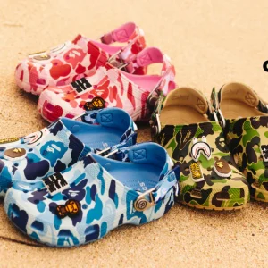 The collaboration between Bape and the two created one of the most talked-about streetwear footwear releases in France and across Europe. The Crocs Bape Collection combines the comfort of Crocs’ iconic Classic Clog with BAPE’s legendary ABC camouflage patterns, bringing together luxury streetwear fashion and casual everyday footwear.